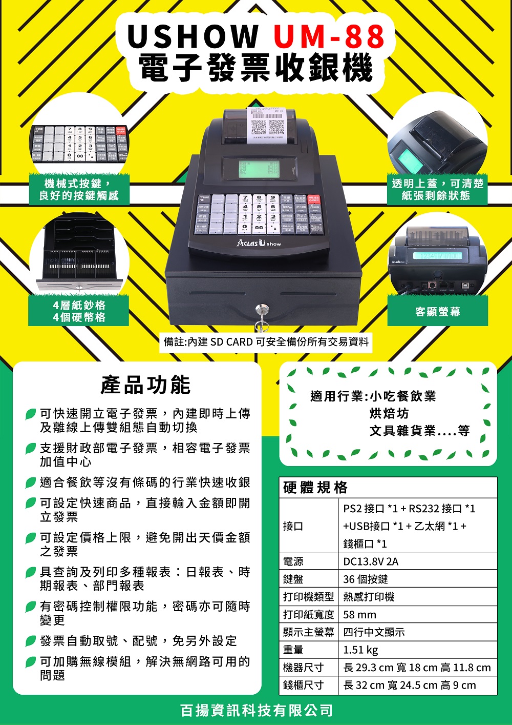 ▲ 內建SD CARD可安全備份所有交易資料。 ▲ 易裝紙結構,方便快速換紙,發票缺紙偵測及作廢自動重開功能。 ▲ 機械式按鍵,良好的按鍵觸感。 ▲ 透明上蓋,可清楚紙張剩餘狀態。 ▲ 鍵盤:36個按鍵。 ▲ 打印機類型:熱感打印機。 ▲ 打印紙寬度:58 mm。 ▲ 顯示主螢幕:四行中文顯示。 ▲ 接口:PS2 *1 + RS232 *1 +USB *1 + 乙太網 *1 + 錢櫃口 *1。